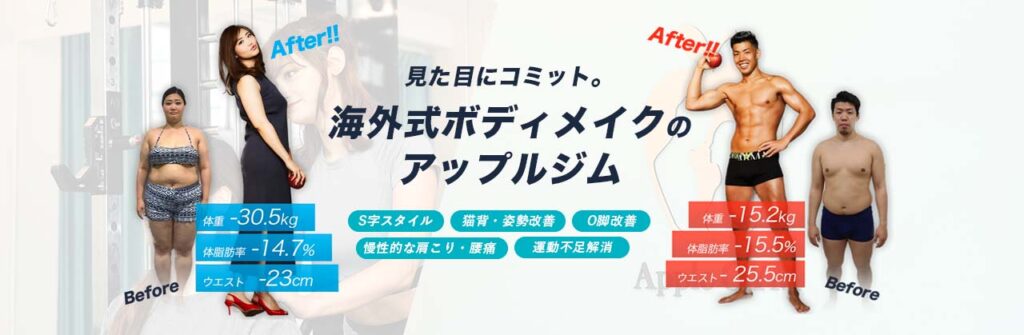 AppleGYM(アップルジム)は、海外の美しいボディラインを追求する「海外式ボディメイク」が特長のパーソナルトレーニングジムです。