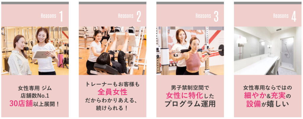 ジムの魅力は、女性専用のトレーニング環境と、ライフスタイルに合わせた食事指導、そして終了後も続く生涯オンラインサポートの3つの柱にあります。