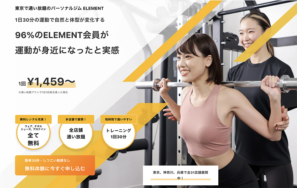| ELEMENT (エレメント) | 33,000円 | 月額28,600円~ | 3,300円 (当日入会で無料) |