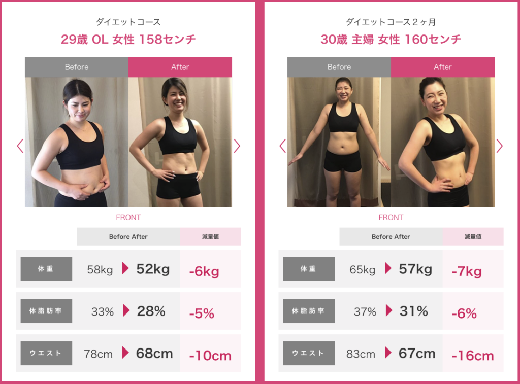 | 料金プラン | 【ダイエットプラン】 2ヶ月/16回:184,800~220,000円 3ヶ月/24回:250,800~303,600円 【チケットプラン】フルタイム 8回:74,800~101,200円 16回:140,800~193,600円 24回:198,000~277,200円 32回:246,400~352,000円 ※料金は店舗により異なります。 |