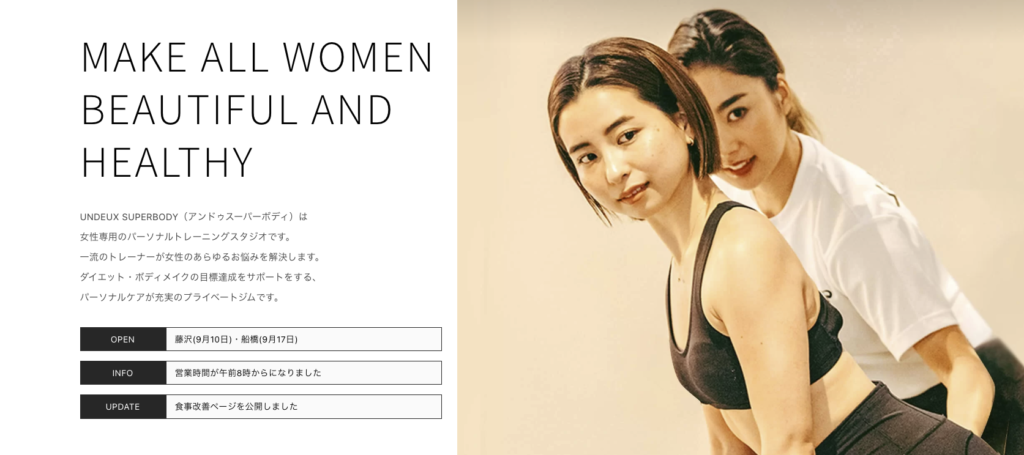 | 【女性専用】 UNDEUX SUPERBODY (アンドゥスーパーボディ) | 33,000円 | 総額:220,000円〜 分割:7,800円〜 | 体験トレーニング ☞キャンペーン中は無料 |