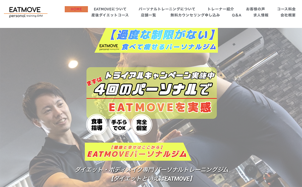 敦賀市でおすすめのパーソナルトレーニングジムは、EATMOVEです。 トレーナーは大手ジムで店長やマネージャーを経験した熟練者ばかりで、安心してトレーニングメニューを任せられます。
