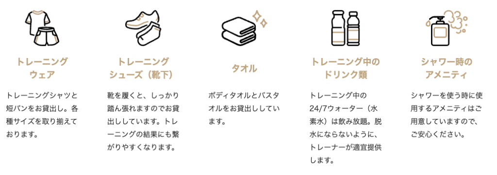 トレーニングウェアやシューズ、タオル、水素水、シャワー後のアメニティは無料で提供されていますので、これらの基本アイテムには追加料金は発生しません。