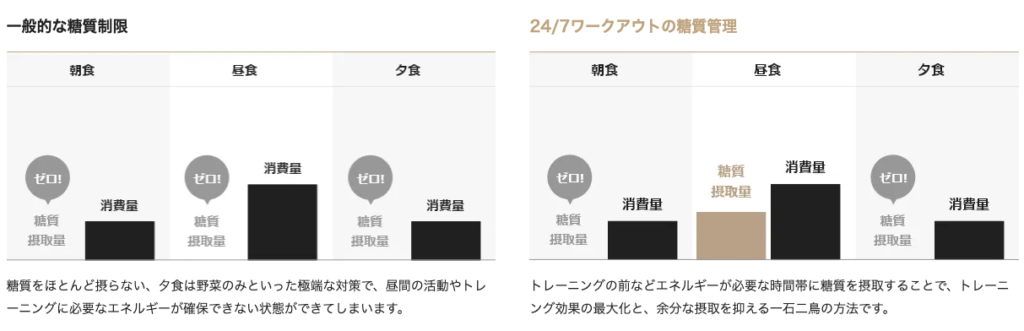 24/7ワークアウトでは、食事や糖質をまったく食べないなどの無理な食事制限をする必要はありません